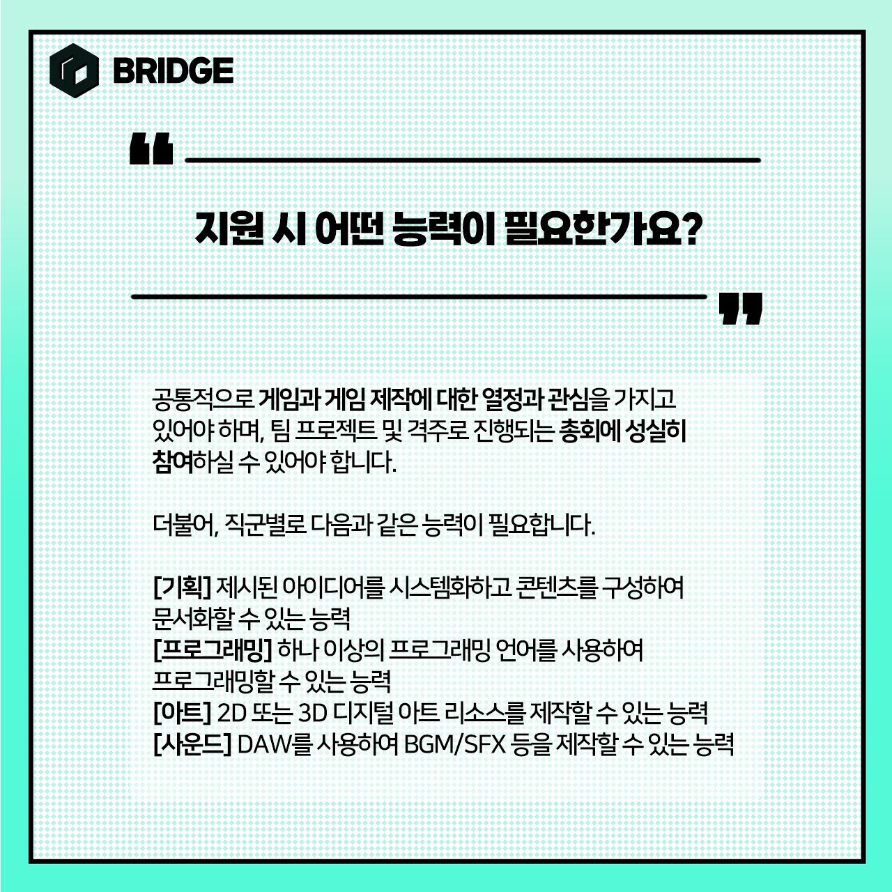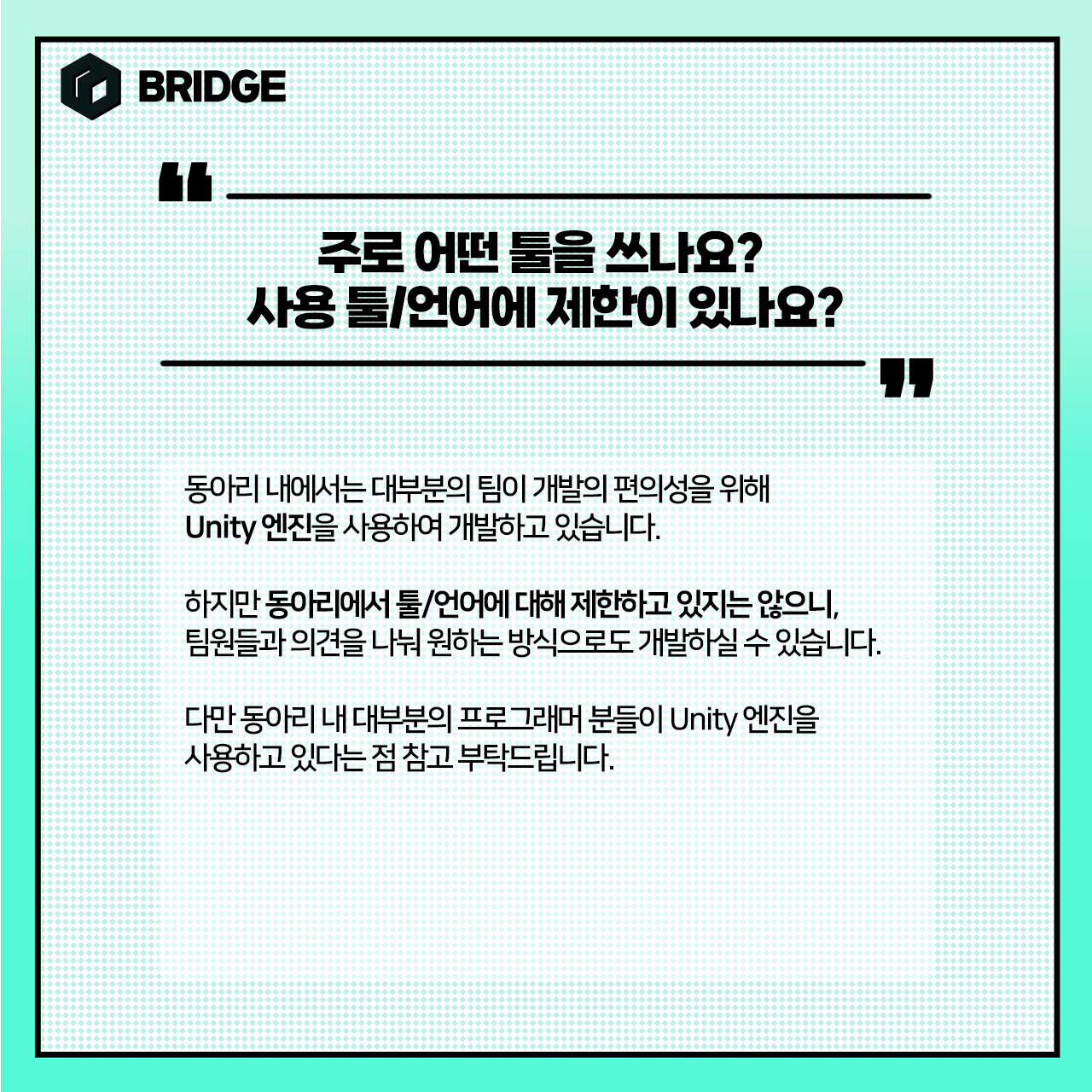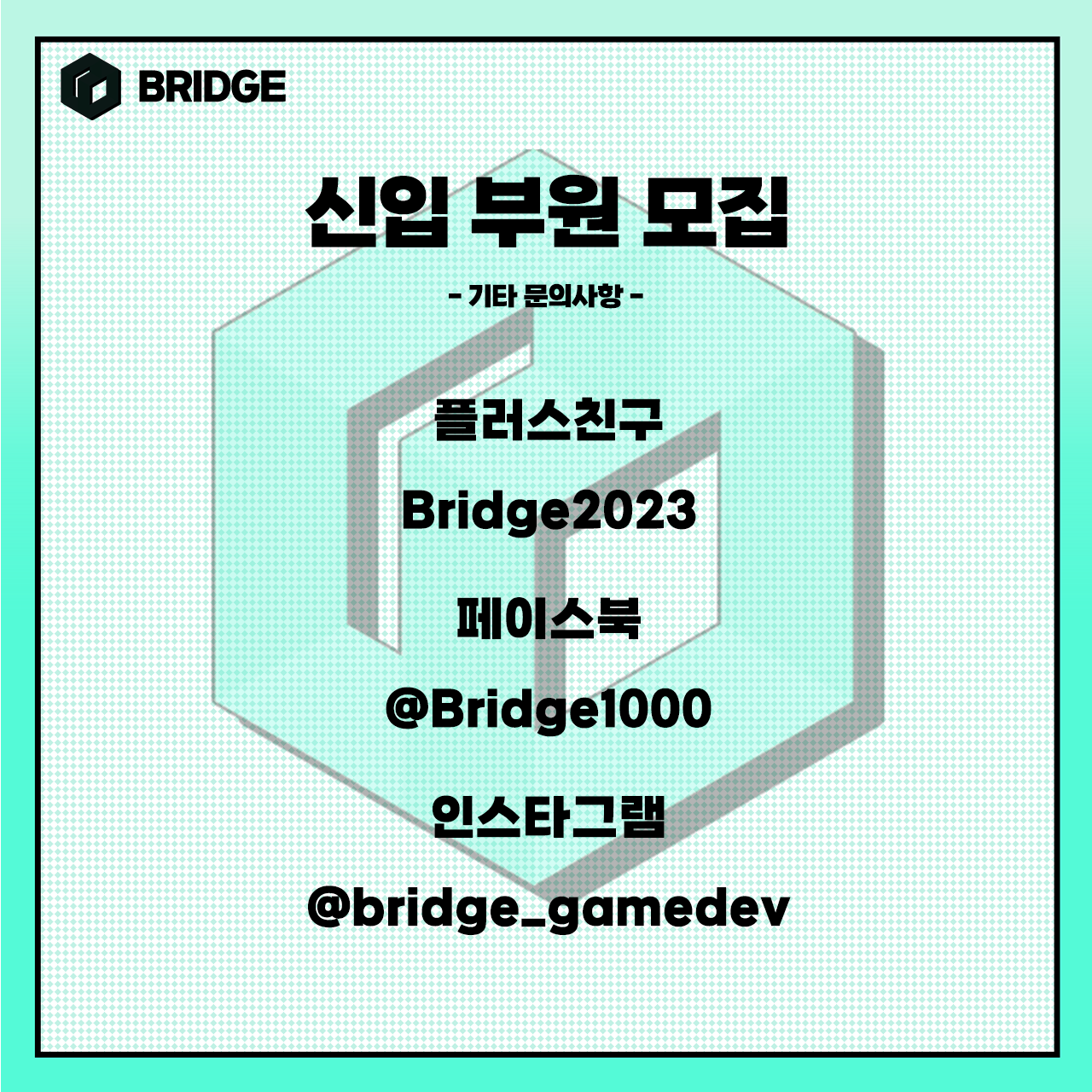 언제든 카카오톡채널 검색 'Bridge2023', 페이스북 @bridge1000, 인스타그램 @bridge_gamedev 으로 문의주세요!