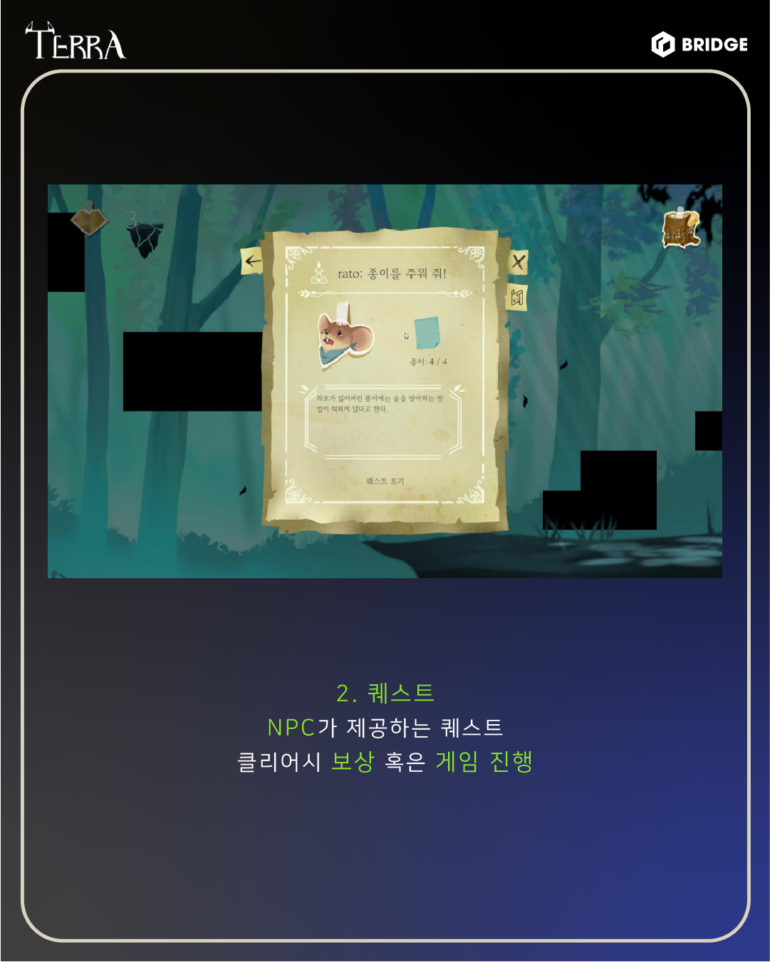 게임 내의 NPC가 제공하는 퀘스트를 받아 클리어하고 보상을 받을 수 있습니다.