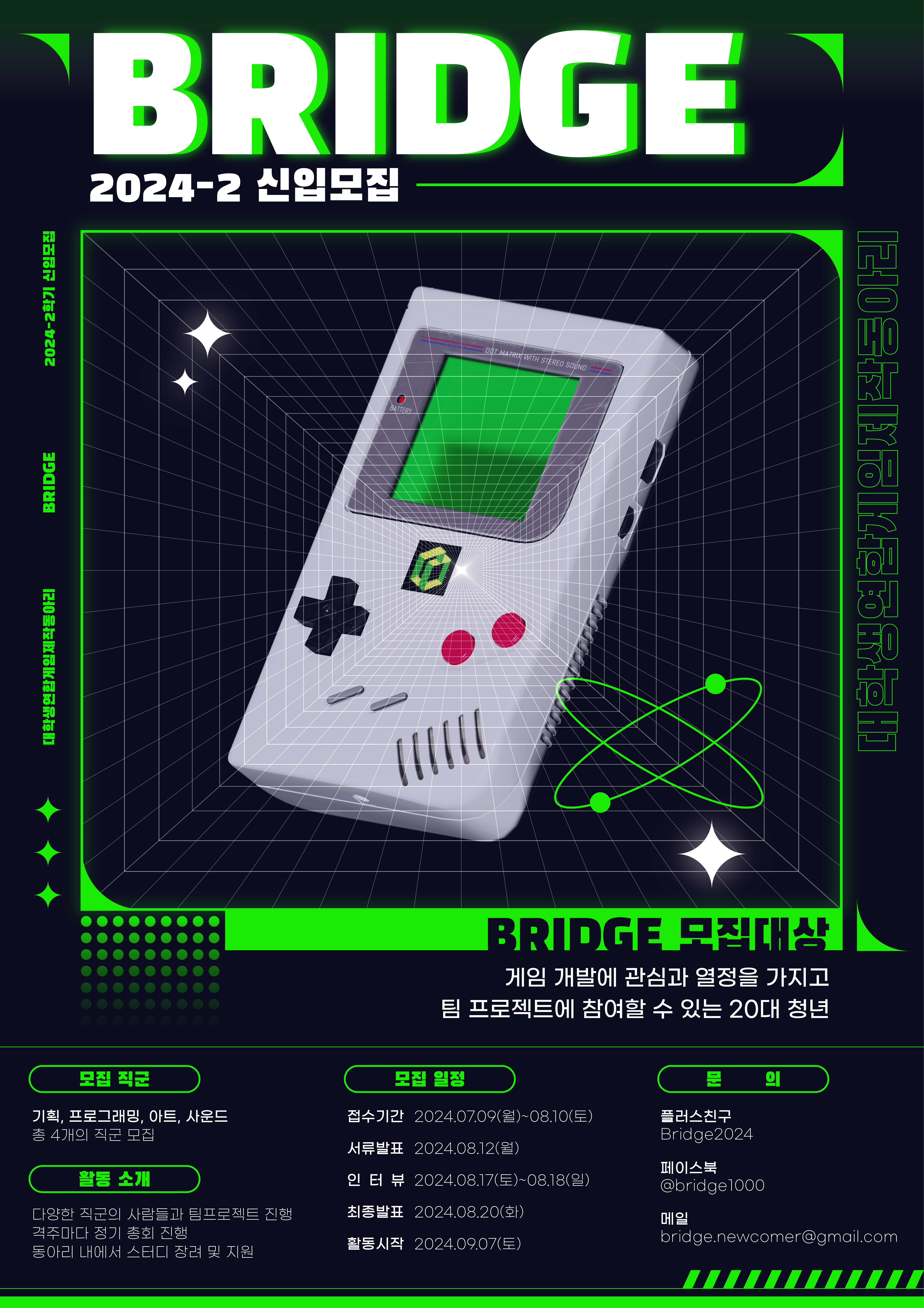 🎮 대학생 연합 게임 제작 동아리 BRIDGE에서 2024-2학기 신입 회원을 모집합니다! 🎮