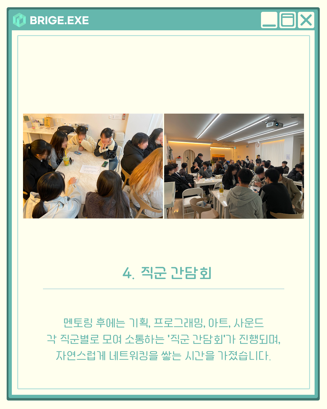 여러 변경 사항이 있었던 팀 빌딩 방식부터, 프로젝트에 도움이 될 만한 내용으로 진행된 프로젝트 멘토링, 직군 간담회까지