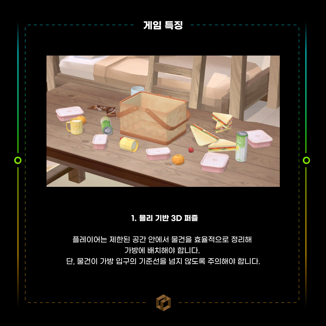 플레이어는 제한된 공간 안에서 물건을 효율적으로 정리해 가방에 배치해야 합니다.