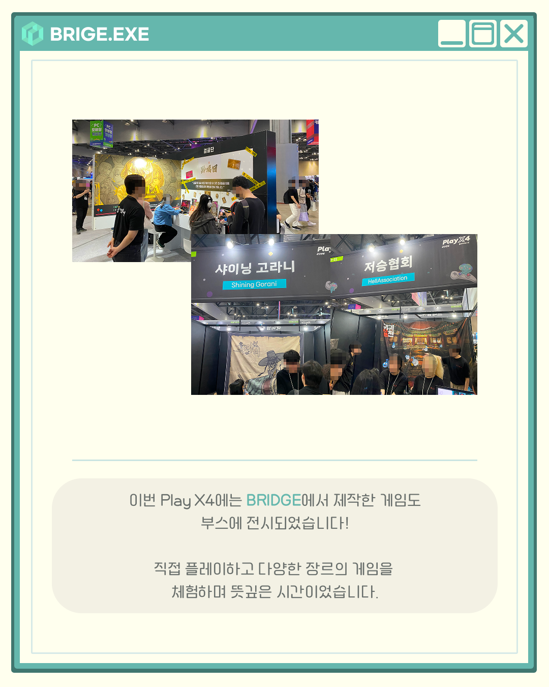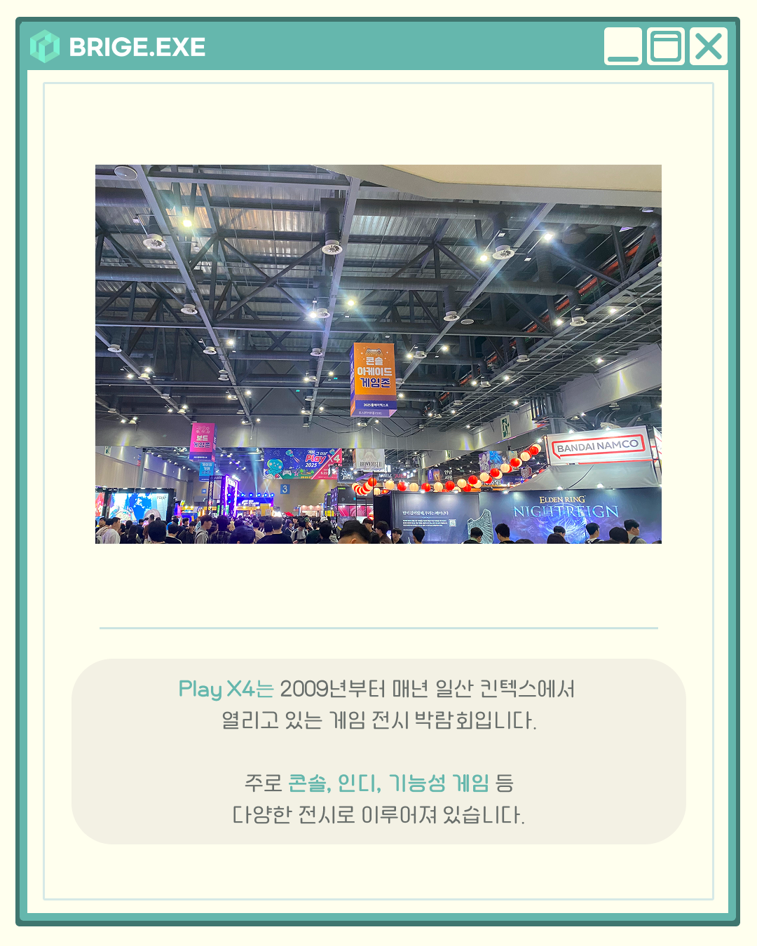 브릿지 출신 게임을 비롯한 인디 게임 전시와 아케이드, E-Sports 무대, 보드게임 등