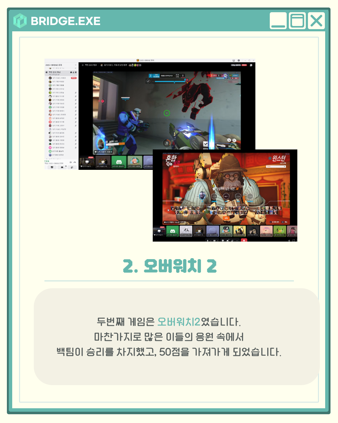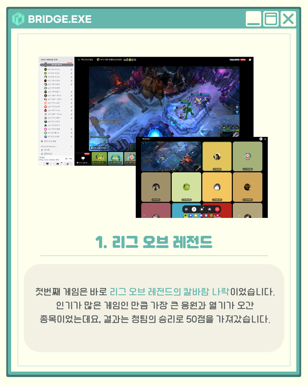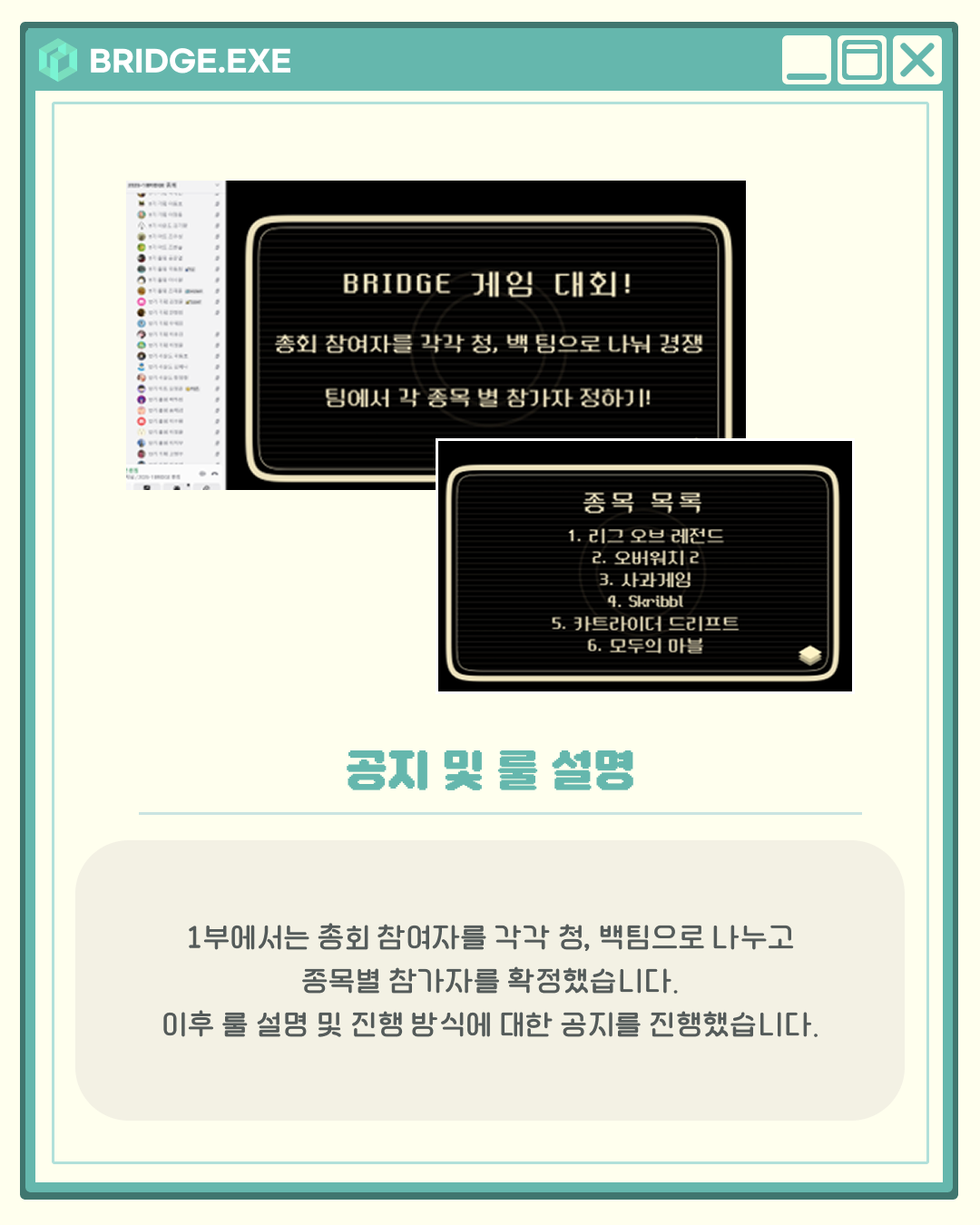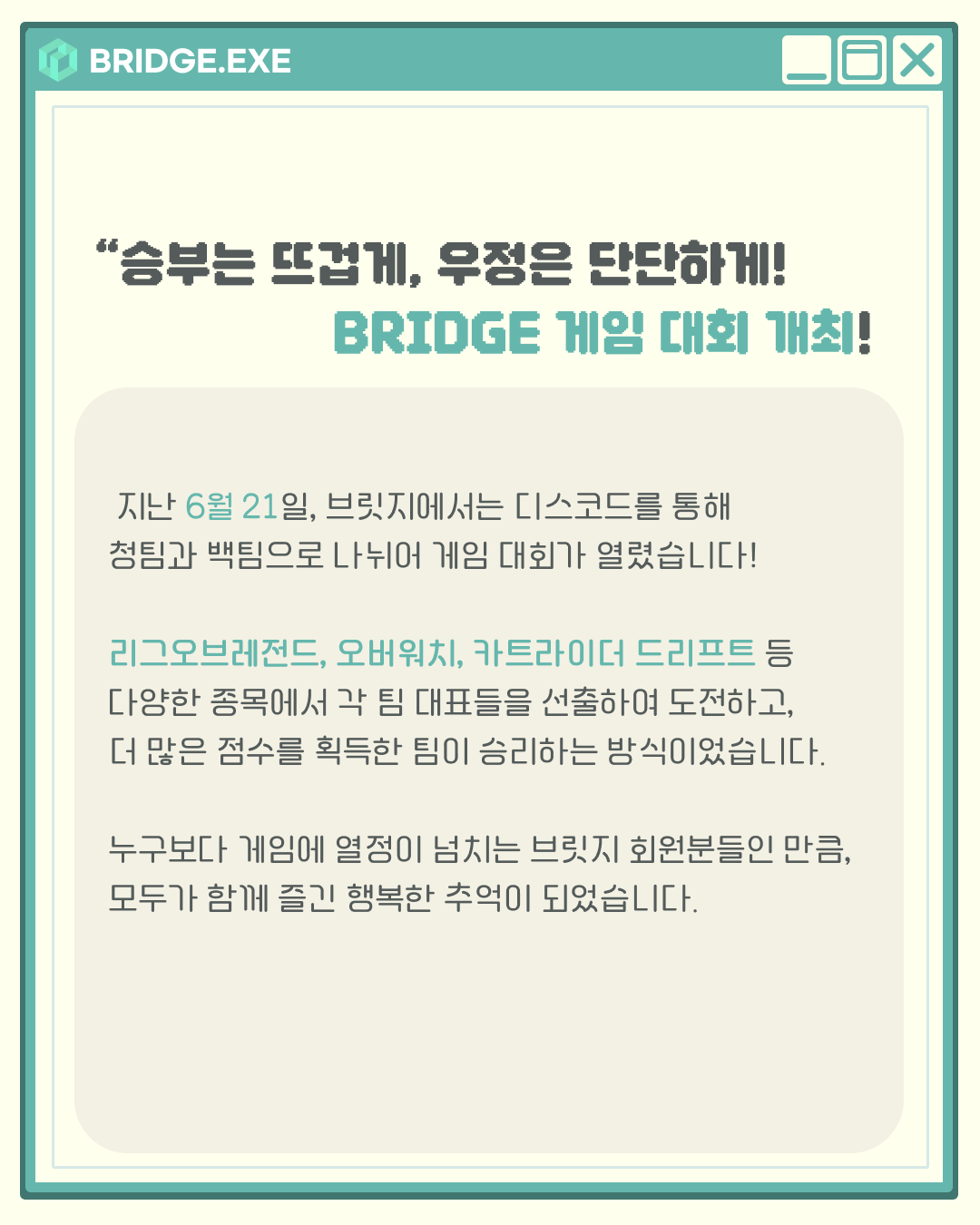 지난 6월 21일, 브릿지에서는 디스코드를 통해 청팀과 백팀으로 나뉘어 게임 대회가 열렸습니다.