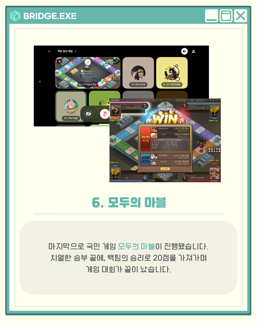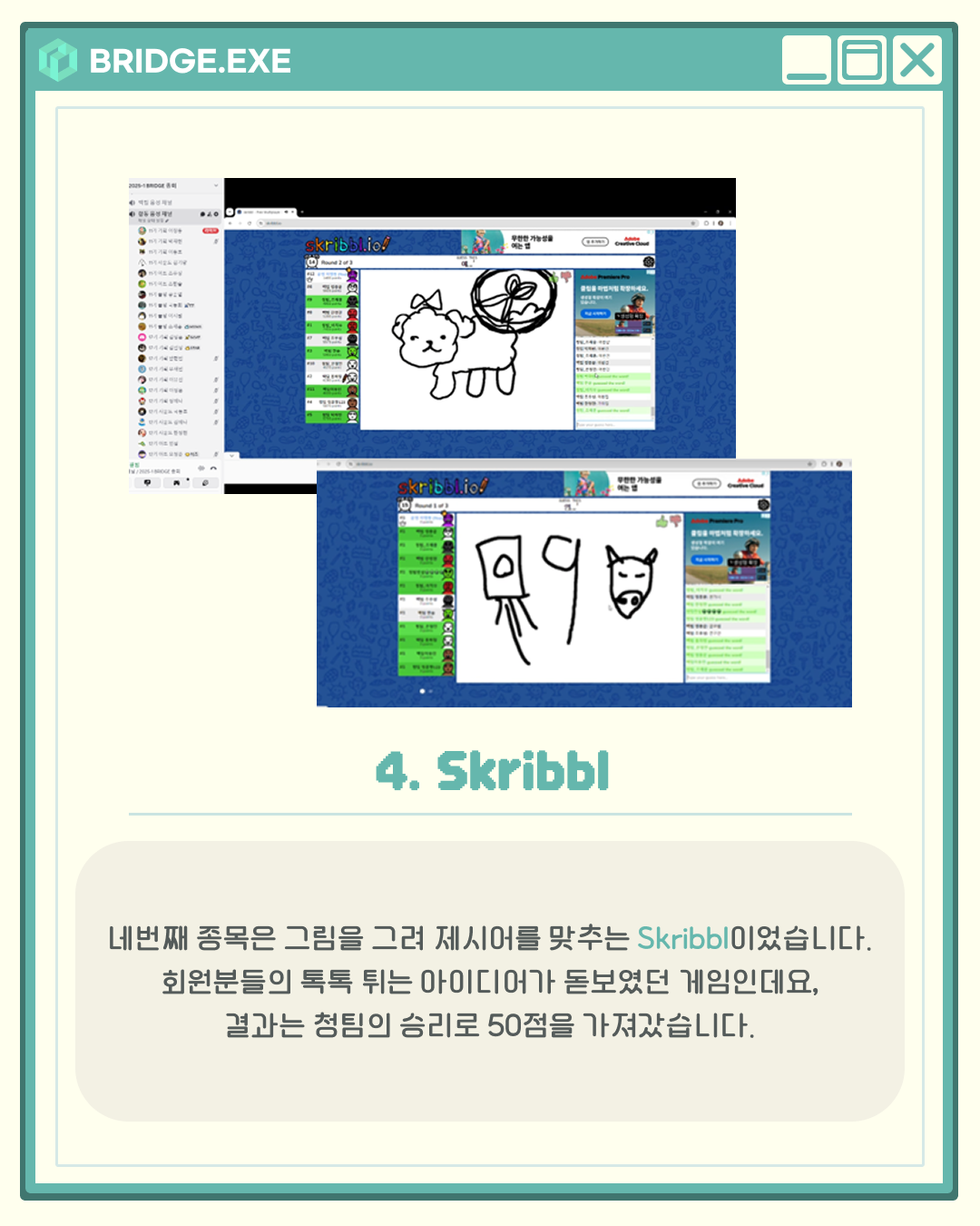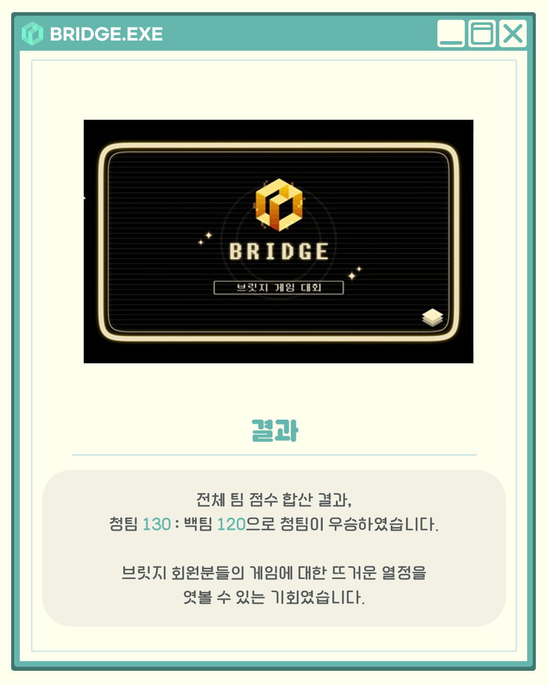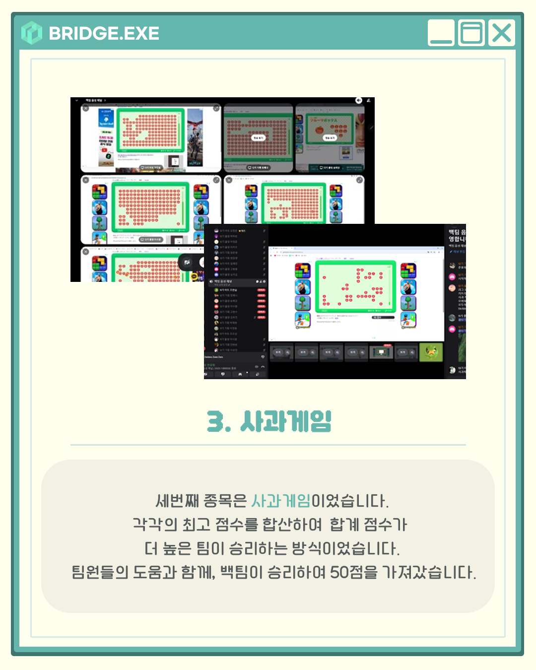지난 6월 21일, 브릿지에서는 디스코드를 통해 청팀과 백팀으로 나뉘어 게임 대회가 열렸습니다.