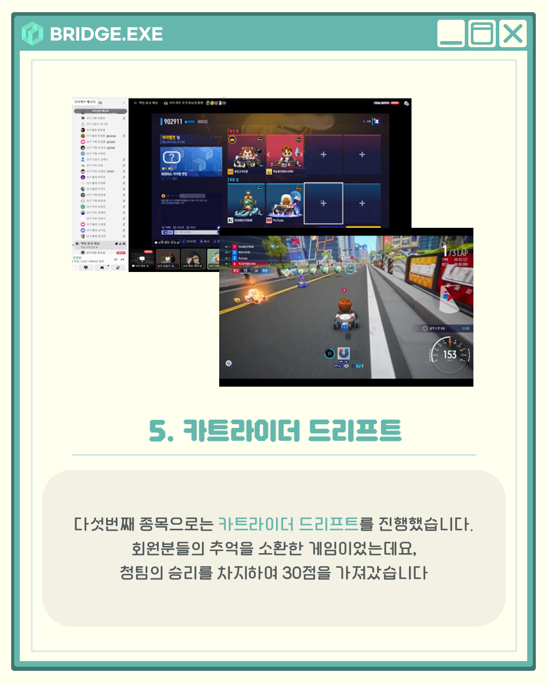 리그오브 레전드, 오버워치, 카트라이더 드리프트 등 다양한 종목에서 각 팀 대표들을 선출하여 도전하고, 더 많은 점수를 획득하는 팀이 승리하는 방식으로 진행되었는데요.