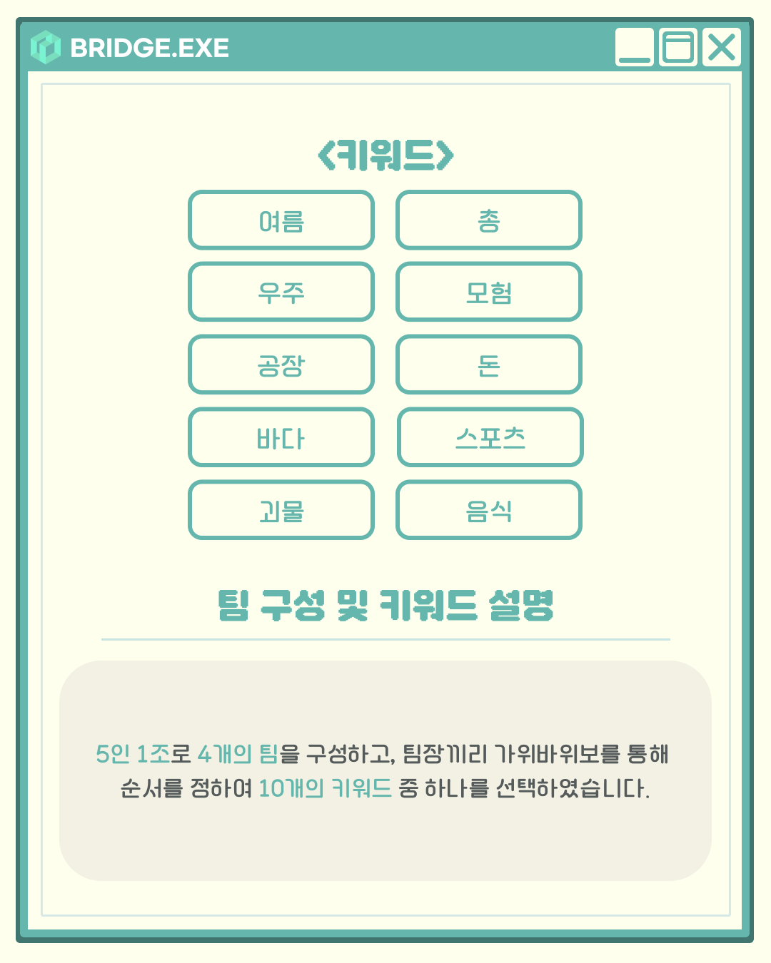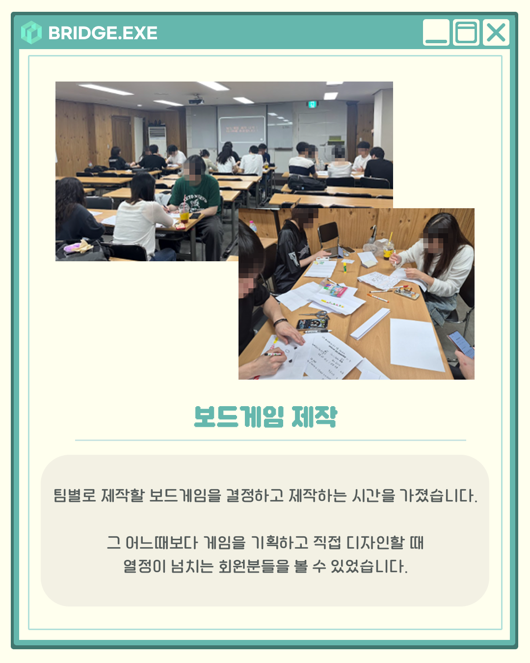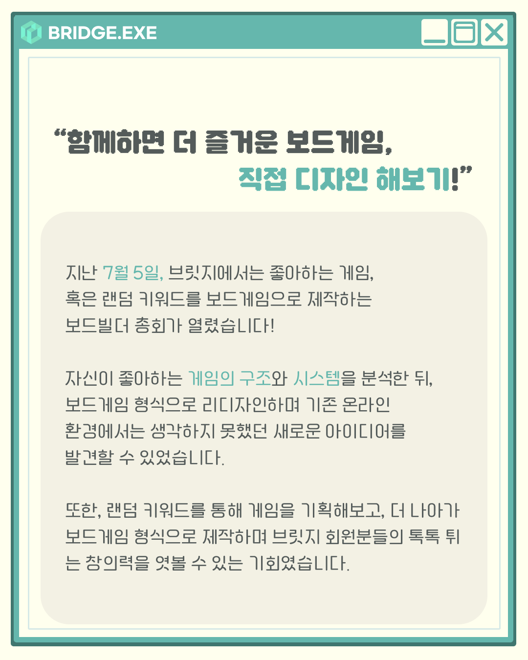지난 7월 5일, 브릿지에서는 좋아하는 게임, 혹은 랜덤 키워드를 보드게임으로 제작하는 <보드빌더> 총회가 열렸습니다.
