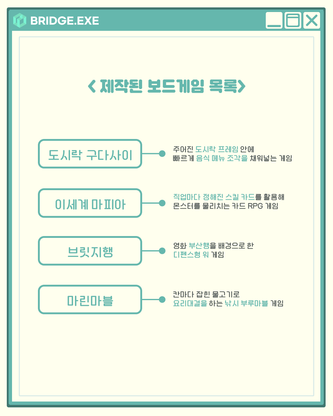 자신이 좋아하는 게임의 구조와 시스템을 분석한 뒤, 보드게임 형식으로 리디자인하며