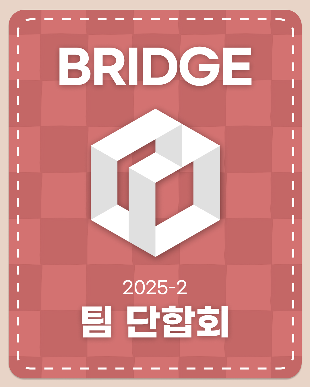 | 🎮[총회] 2025-2 BRIDGE 중간 발표 - 2025.11.29(토)🎮 (0) | 2026.01.09 |