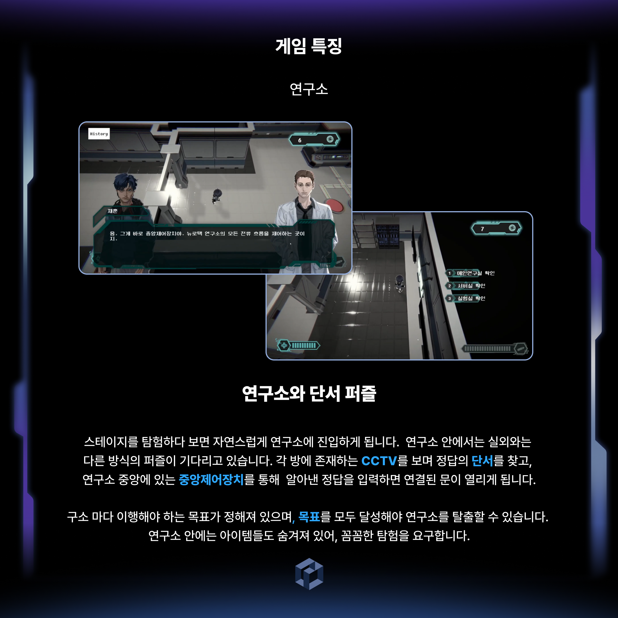 '연구소와 단서 퍼즐', '힐과 강화 포션' 등 다양한 시스템을 즐길 수 있습니다.